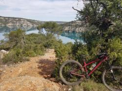 Début sur une piste DFCI totalement refaite jusqu’à une cuve. Ensuite prise d'un single en faux-plat pour faire la première descente avec un passage un peu difficile. Puis nous sommes remontés avec un passage à proximité d'une propriété, je me suis fait courser par un jeune chien sur 200 m. Prise d'un deuxième single en descente vers le lac, avec un passage très difficile, tout le monde a fait ce passage en portage, profitez du panorama. Par la suite, nous sommes remontés par la route sur environ 2 km pour prendre une piste DFCI, cette montée a été compliquée pour moi, la fatigue commençait à se faire ressentir, pour arriver à la 3ème descente. Beau single avec des pierres couvertes de mousse, mais avec un passage sur le bas de la descente en portage, pour 2 personnes sur 5. Et enfin remontée vers les voitures.