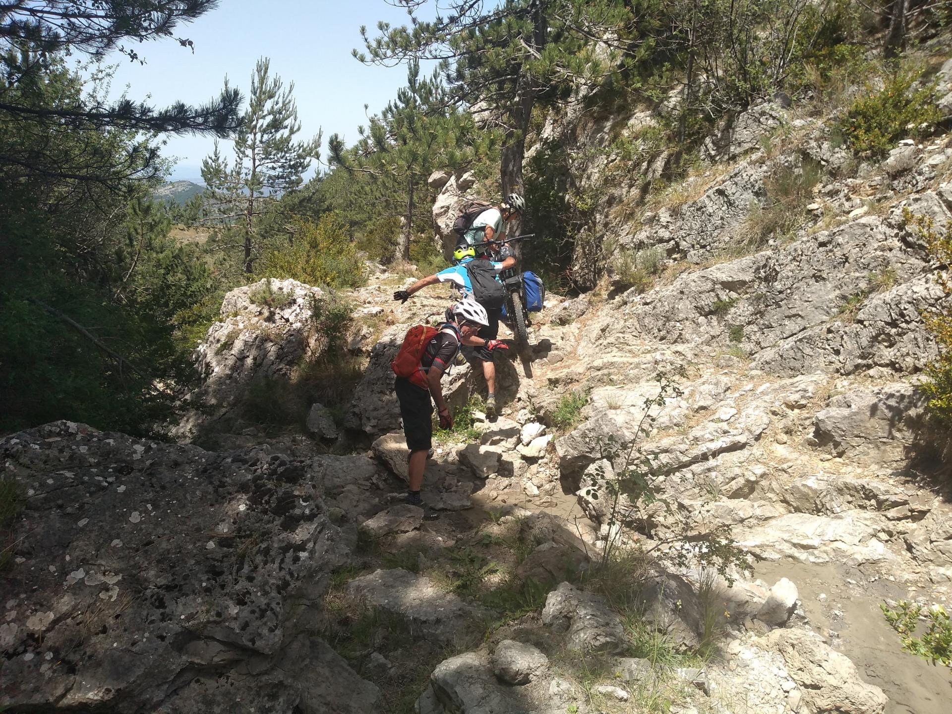 - De Castellane, montée au col de Lèque, au km 4, prendre le single à gauche, on rejoint une piste forestière au point coté 1087 (IGN). Au point coté 1247 (IGN) possibilité de prendre la piste forestière à gauche jusqu'au pylône où on laisse les vélos. Un sentier permet d'accéder à un point de vue sur les Cadières de Brandis (photo 1).