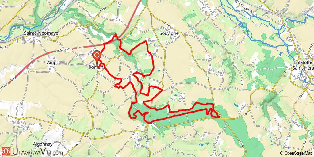 Tour de Saint-Maixent-l'Ecole, en passant par Exireuil, Nanteuil, le parcourt VTT du bois de Faye, Sainte-Eanne, Souvigné, Saint-Martin-de-Saint-Maixent. Pas mal de montées sur ce parcours. Le parcourt VTT du bois de Faye est assez technique (épingles, quelques virages relevés et petits gaps).