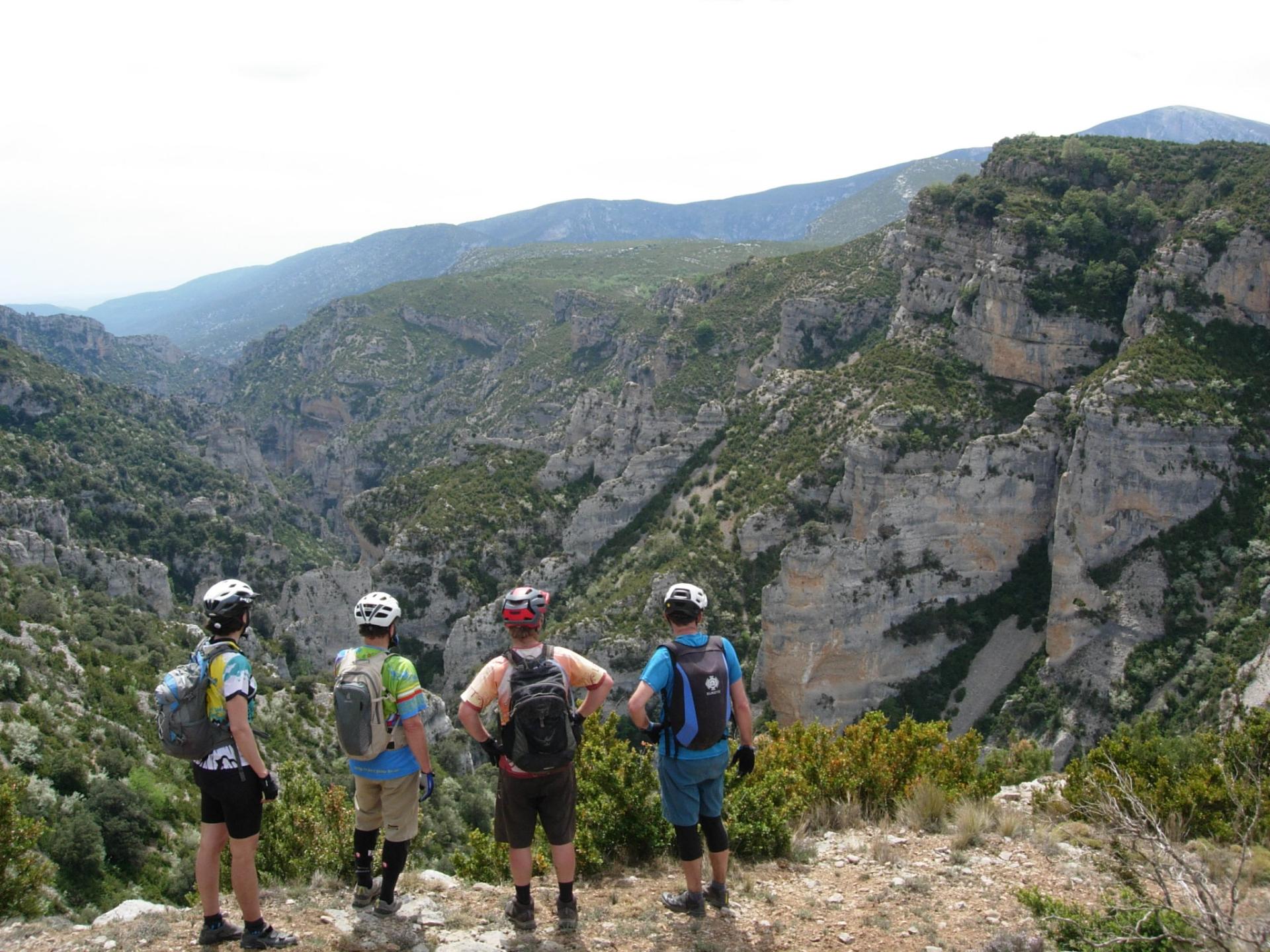 Km 15, à nouveau une belle descente pour rejoindre le fond du canyon de Mascum. Il y a de la caillasse mais elle se fait sur le vélo. Quelques épingles pas trop difficiles titillent le plaisir du pilotage. Dans la descente, n'hésitez à faire de petites pauses pour apprécier le gigantisme du canyon avec ses vautours fauves. La Cuca Bellostas, la Torre de Santiago déploient leur féerie.