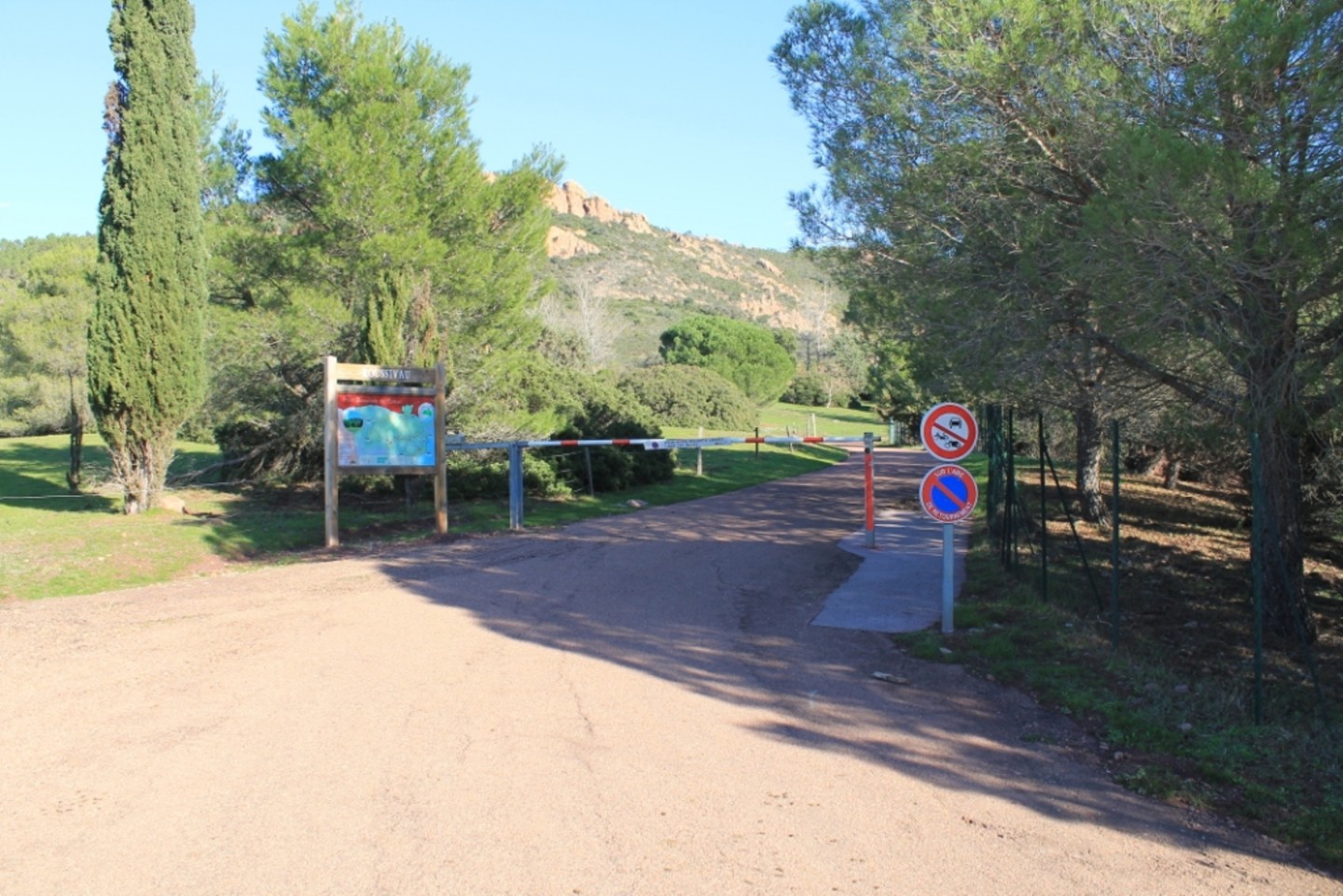 Une fois arrivé à la maison forestière du Malpey, prenez à droite sur une portion de route goudronnée jusqu'au col de l'Aire de l'Olivier (stèle). Prendre la piste descendante (ravin du Perthus) jusqu'au pont du Perthus.