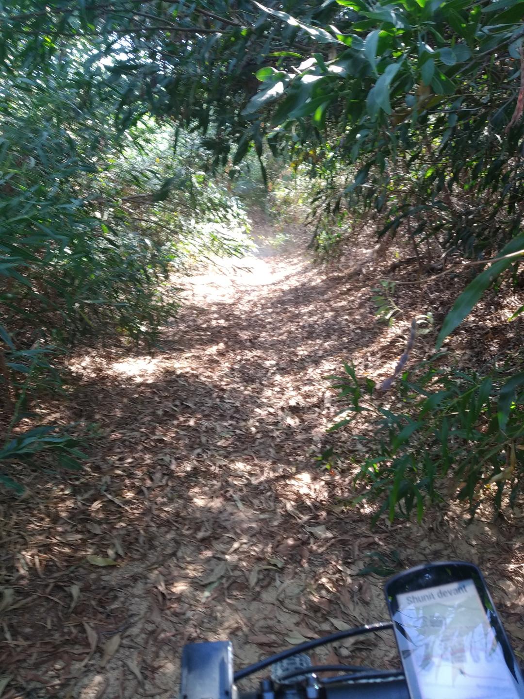 Praticabilité = difficile, encombrement latérale, sentier sur creusé, végétation importante, passage très étroit entre arbres et buissons.