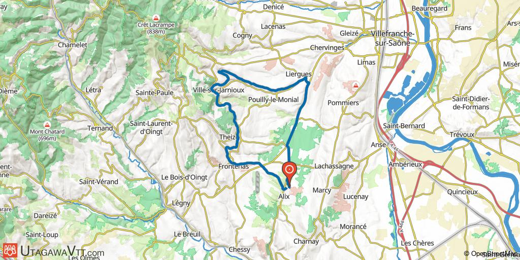Début dans un bois, ensuite belle descente facile sur Alix; vous traversez Alix. Ensuite vous traversez un bois et montez vers les carrières de Bagnols (petite montée un peu raide). Vous rejoignez ensuite Theizé (deuxième petite montée jusqu'au cimetière) avec le château de Belledonne. Vous aurez ensuite un chemin caillouteux qui rejoint la route le Bois d'Oingt - Villefranche et après avoir traversé la route, vous rentrez dans les bois d'Alix. Vers la fin, vous rejoignez votre trace de départ en un point pour la laisser sur votre droite.