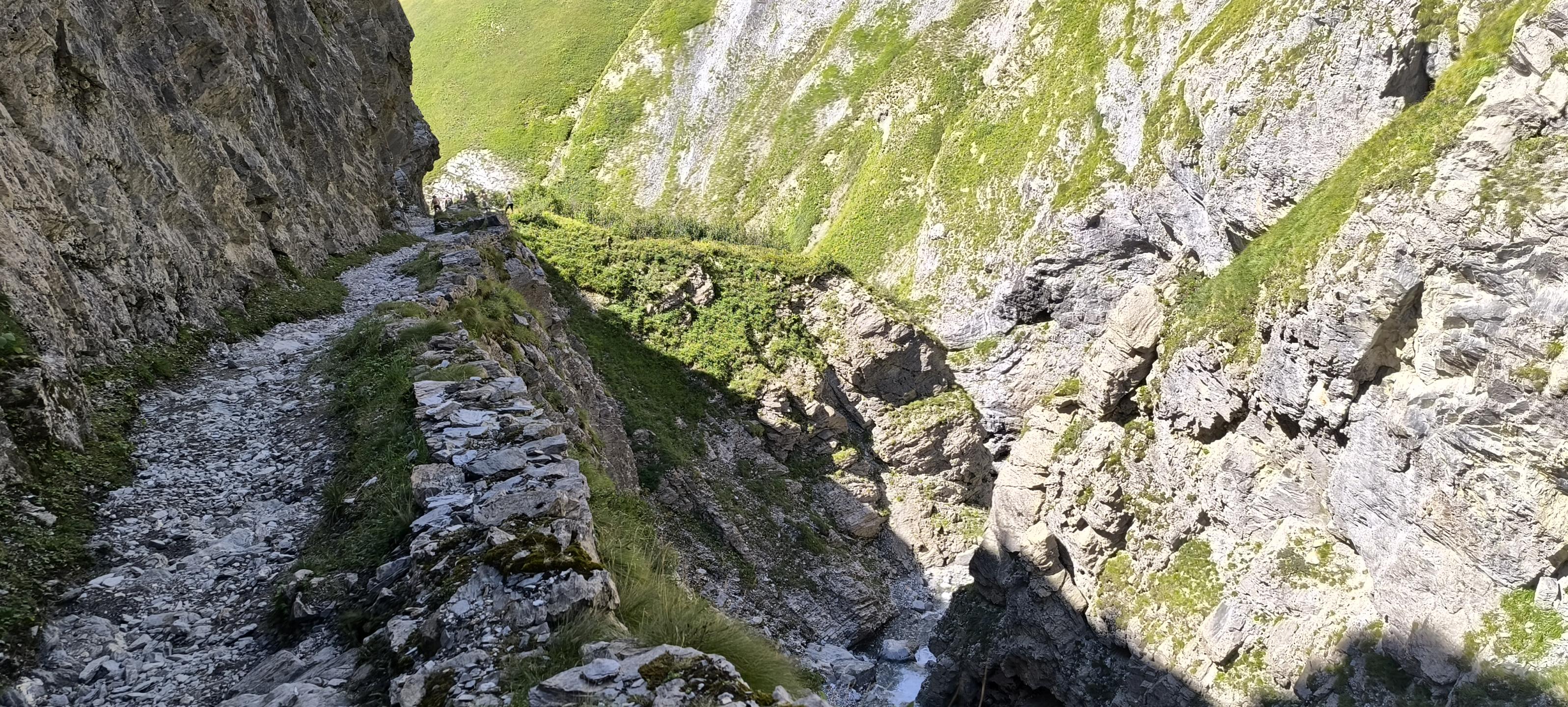 Km 14, alt 2329 m, au col du Bonhomme, il faut quitter le GR surfréquenté pour prendre à gauche le beau sentier de la Saussaz. Il présente des épingles un peu ravinées dans le pentu pour rejoindre l'extraordinaire single du Curé.