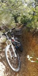 Du sommet, filer à l'ouest. A un col, s'engager plein sud dans la descente, ça devient de plus en plus étroit et pentu. Certains virages sont très très difficiles à gérer dans la partie haute en pierrier. Ça devient plus calme et stable plus bas, avec le passage dans le lit d'un torrent. L'intersection suivante est à 540 m d'altitude. Plus on descend, et plus c'est roulant.