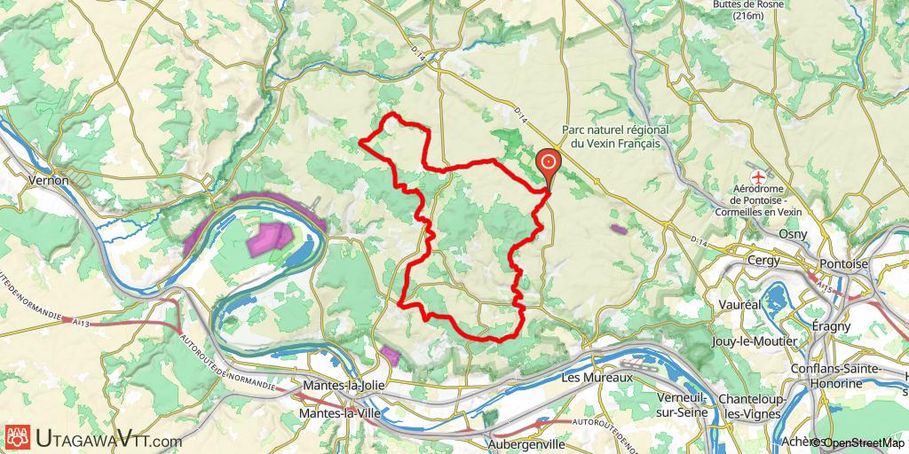 Au départ d'Avernes, direction sud-ouest pour rejoindre le bois de Gallus que l'on parcourt en direction de Lainville-en-Vexin (attention au km 3,5 il y a un mur pratiquement impossible à passer sur le vélo... je doute même qu'on puisse le grimper en poussant le vélo par temps humide...). Poursuivre direction ouest par Aincourt puis Saint-Cyr-sur-Arthies avant d'atteindre Vétheuil par une très belle descente. Après Vétheuil, remonter sur le plateau par une belle et rude montée (cailloux et racines...) pour atteindre Saint-Martin-la-Garenne. Poursuivre par une section plane dans les bois avant de revenir sur Follainville-Dennemont. Faire le tour de la butte au sud du village et poursuivre en direction de Limay pour atteindre un beau point de vue sur Mantes et la vallée de la Seine (point de vue du Saint-Sauveur). Remonter vers le nord puis prendre vers l'est pour atteindre Sailly. Remonter à la ferme de Maigremont puis dévaler sur Montalet-les-Bois. Remonter vers Jambville et revenir dans le bois de Gallus, où l'on pourra tournicoter au gré des chemins et layons qui permettent de le sillonner. Revenir sur Avernes où l'on pourra aller se restaurer au bistrot T'Avernes.