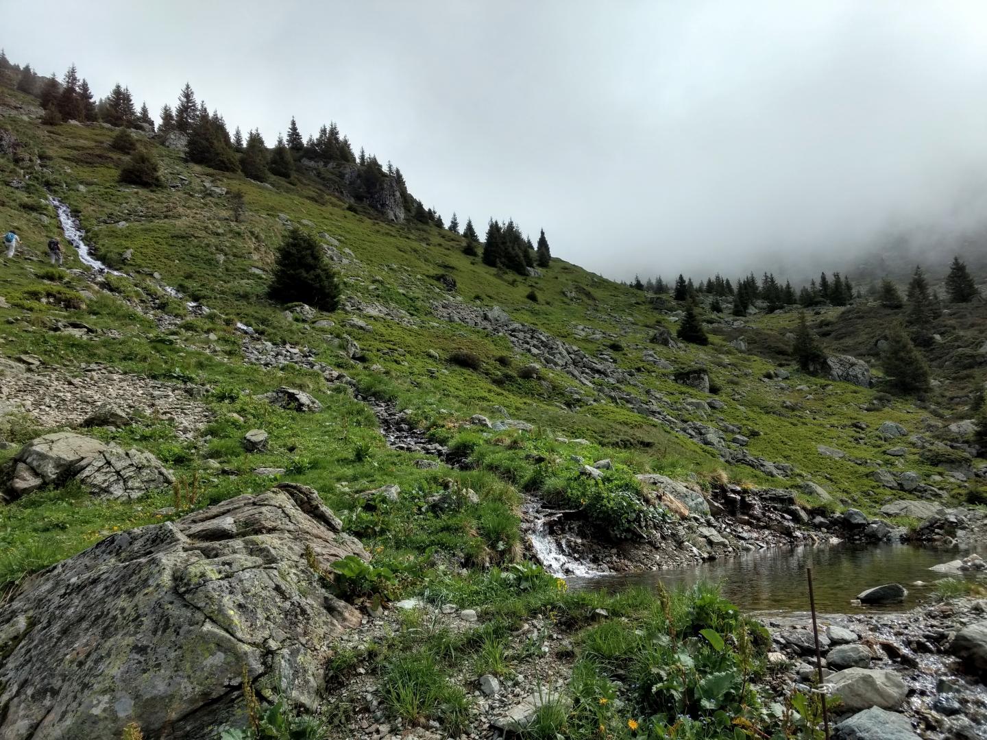 Continuez toujours tout droit, vous passez entre les bâtiments de la colonie. Une courte section vous fera penser à des pavés. Après 600 m, vous arrivez dans la zone des jonquilles et crocus. Vous avez pris de l'altitude et la fatigue vous gagne peut-être un peu mais votre champ de vision s'élargit et le paysage devient plus beau encore. Ensuite, 800 m plus loin, au Habert du Pré de l'Arc d'en haut, c'est la zone des gentianes, pensées, bois-joli, orchis... Après 800 m, vous êtes pratiquement sous le sommet Le Jas des Lièvres d'où viennent plusieurs petits ruisseaux dont certains finissent en petites cascades sur le chemin. Là vous avez une vue imprenable sur les sommets assez imposants du Ferrouillet qui culmine presque à 2500 m. La piste devient assez caillouteuse et se transforme en sentier tout en descendant sur 350 m.