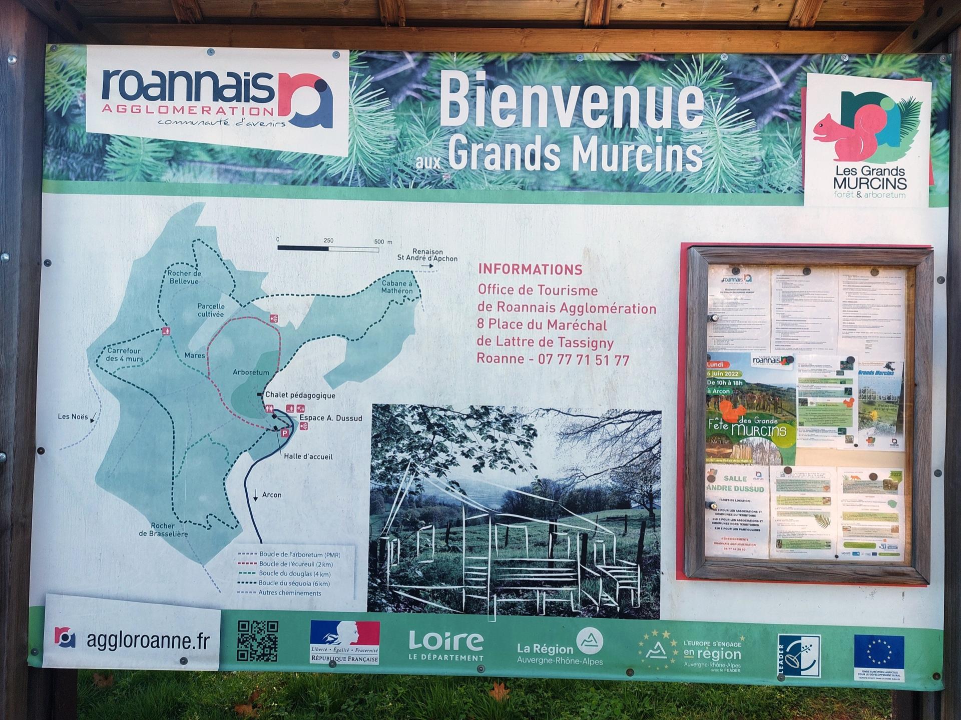 Départ du parking des Grands Murcins (arboretum) à Arcon (panneau des circuits VTT-FFC).