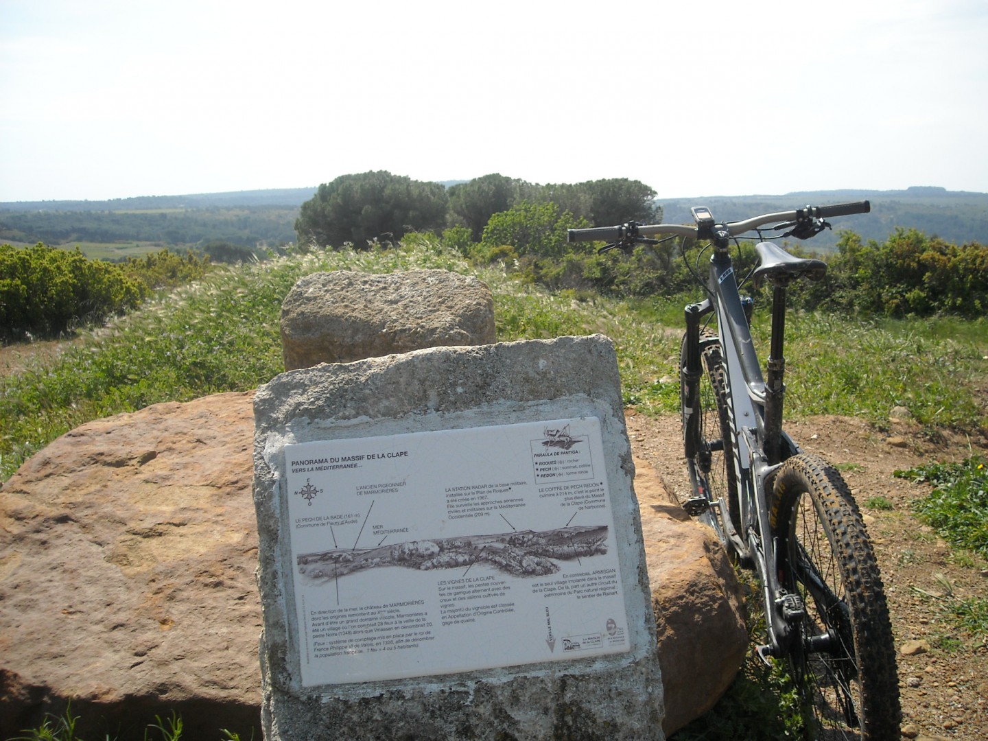 Km 7,7 la table d'orientation permet d'avoir un panorama élargi sur le massif de la Clape avec le pech de la Bade, la station radar, la mer Méditerranée, le coffre de Pech Redon, les constructions historiques de Narbonne, le tout cerné par les vignes.