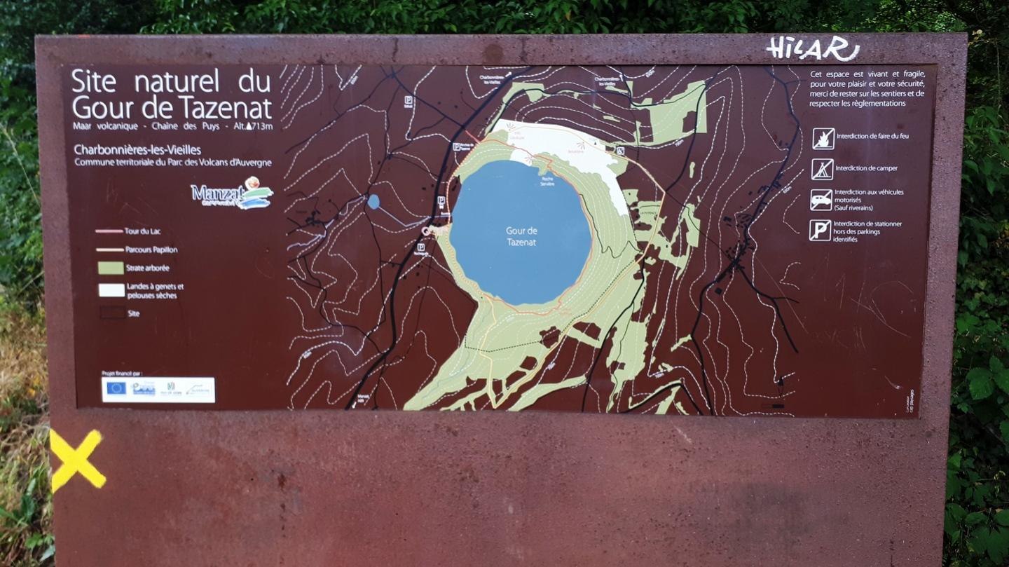 Départ du parking sud au Gour de Tazenat pour cette trace, mais on peut aussi démarrer du parking nord (Tazenat se situe sur la commune de Charbonnières-les-Vieilles (63410).