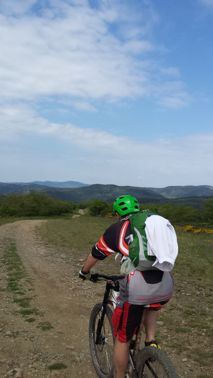 Départ du col du Vent pour rejoindre rapidement le GR 74 et une petite descente en single caillouteux pour chauffer les amortisseurs. Belle vue sur la vallée de St-Privat. Par piste et bitume, direction le Puech Bouissou pour une sente rapide et propre qui nous mène au Rocher des Vierges.