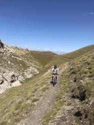 Un rude portage (mais le sentier est très bien tracé dans un raide pierrier) permet alors de se hisser sur la crête frontalière du col de Stroppia (2865 m). Après avoir perdu plus de 300 m de dénivelé (descente parfois chaotique, dont certains passages se font de préférence à pied...), le parcours s’élève à nouveau jusqu’au col de la Gypière (2927 m), situé en contrebas de la Tête de la Fremma (3151 m, sommet intégralement cyclable à la descente en dehors de deux passages longs de quelques mètres - à condition de viser sous le sommet la sente dévalant à gauche -).
