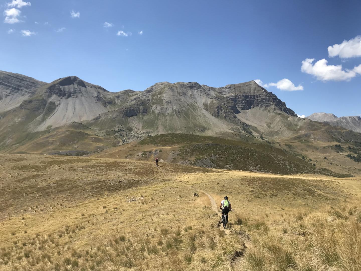 Au col, sous le regard du sommet calcaire de la Mortice (3186 m ; objectif classique à VTT...), débute un long et beau parcours panoramique de crête, via la Tête de Paneyron (2785 m, magnifiques passages à vélo, entrecoupés de quelques courtes montées avec sa bécane sur l'épaule), parcours s’achevant au col routier de Vars (2108 m, 18,4 km, 3 h 20) où l’on peut casse-croûter et boire un coup (bistrot), malgré un accueil que l’on peut qualifier pudiquement de perfectible (les reproches en cuisine et à l’adresse de certains clients nuisent à la sérénité du site !)...