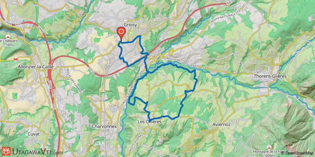 Départ de Groisy. Montée en direction d'Evires par du chemin large et un peu de petites routes. Redescente sur Menthonnex-en-Bornes roulante et raide sur la fin. Deuxième descente sous Villy-le-Bouveret d'abord raide puis en pente douce qui suit la rivière des Usses. Retour sur Groisy.