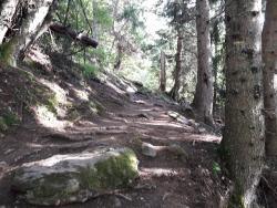 Praticabilité = Difficile, encombrement latéral, sentier surcreusé, végétation importante, passage très étroit entre arbres et buissons.
