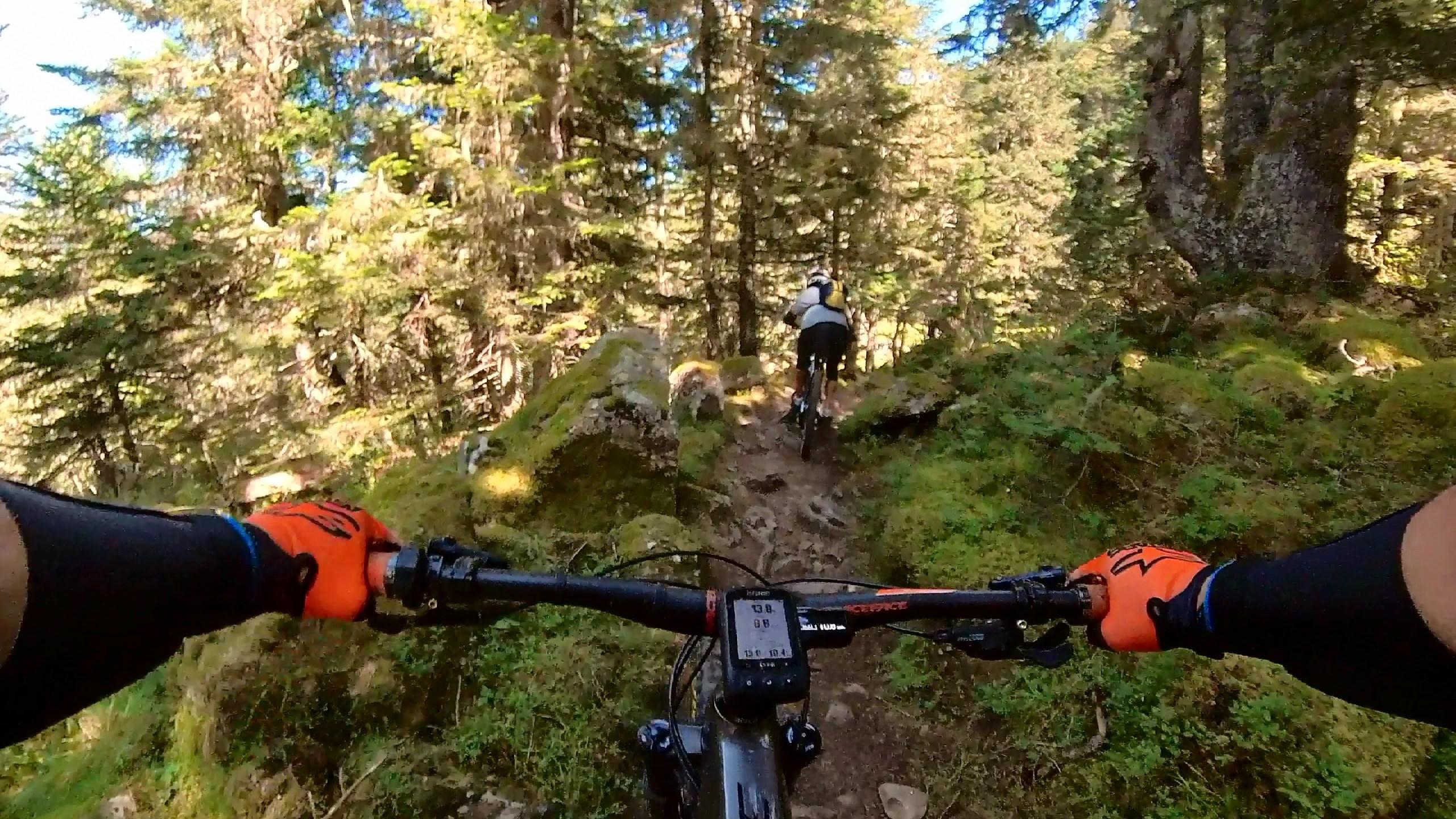 La descente se fait par le même chemin que la montée. Elle demande de très bonnes qualités de pilotage ! Quelques rochers, marches, pierres roulantes ou racines seront les difficultés que vous aurez à franchir, sans compter quelques pentes abruptes, mais la beauté du paysage et les magnifiques singles qui y serpentent vous feront vite oublier ces quelques difficultés. Du pur all mountain dans toute sa splendeur.