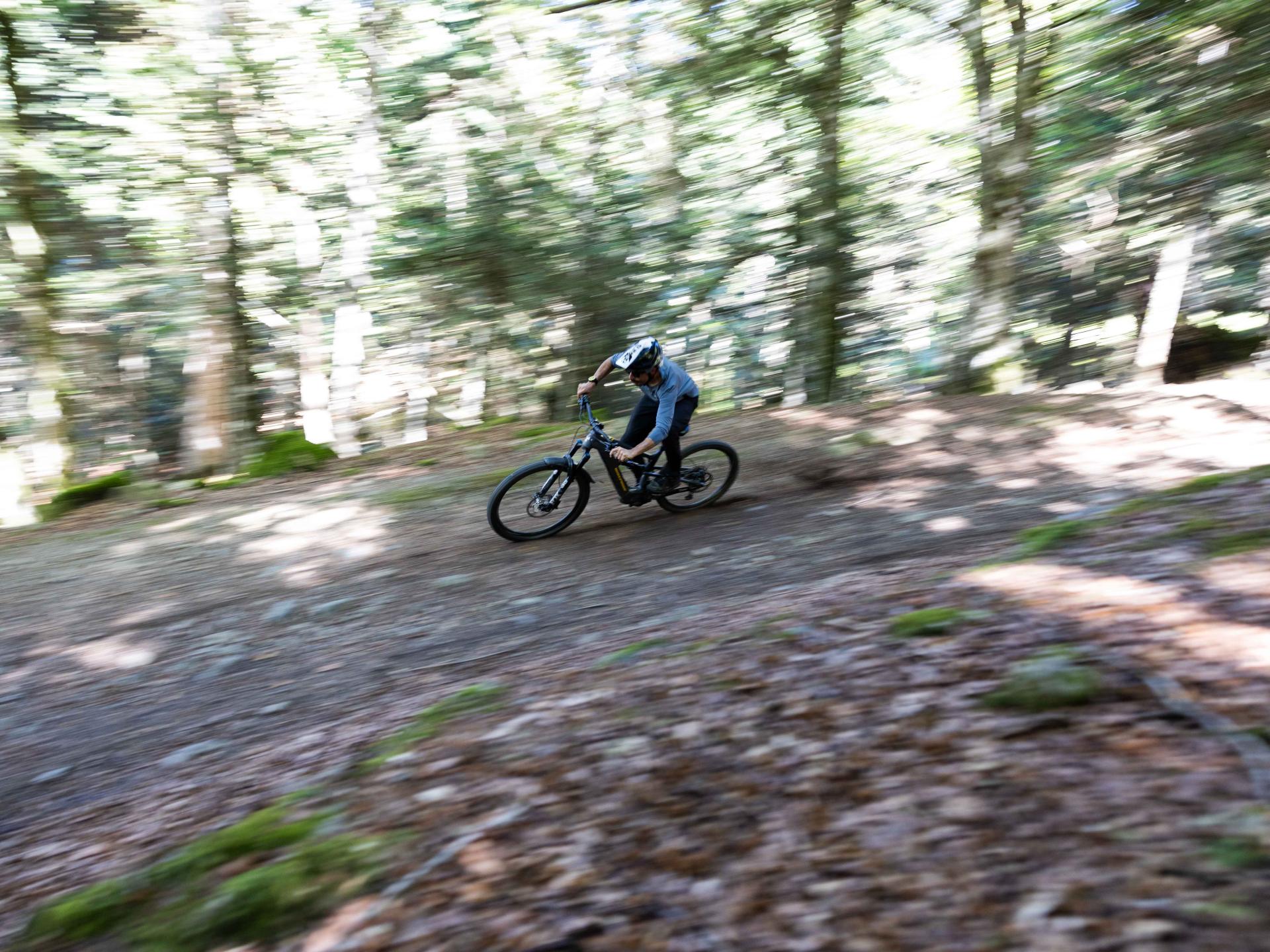 Le parcours alterne des passages faciles et de petites difficultés techniques en naviguant entre pistes forestières et chemins monotraces pour descendre dans la vallée.