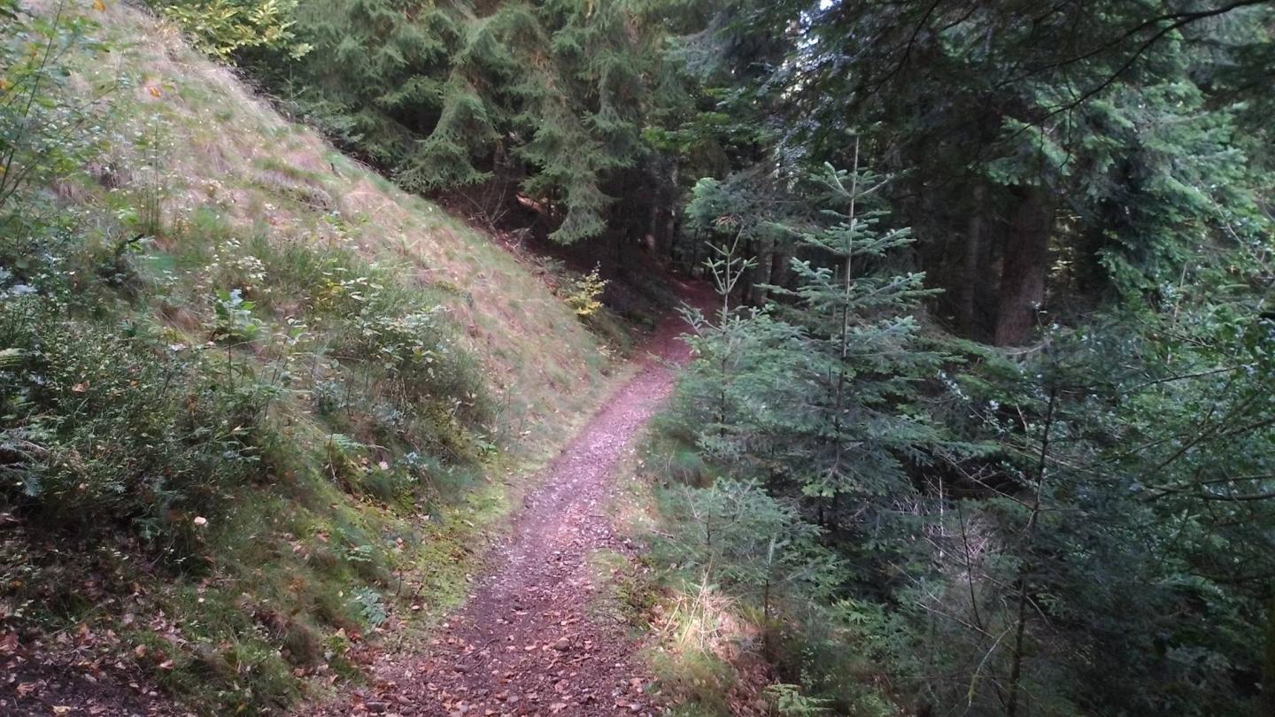 Praticabilité = Difficile, encombrement latéral, sentier surcreusé, végétation importante, passage très étroit entre arbres et buissons.