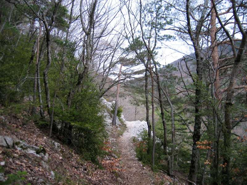 D = Vieux chemin entre murets, sentier quelquefois encombrés de cailloux, racines d'arbre, branche, rochers.