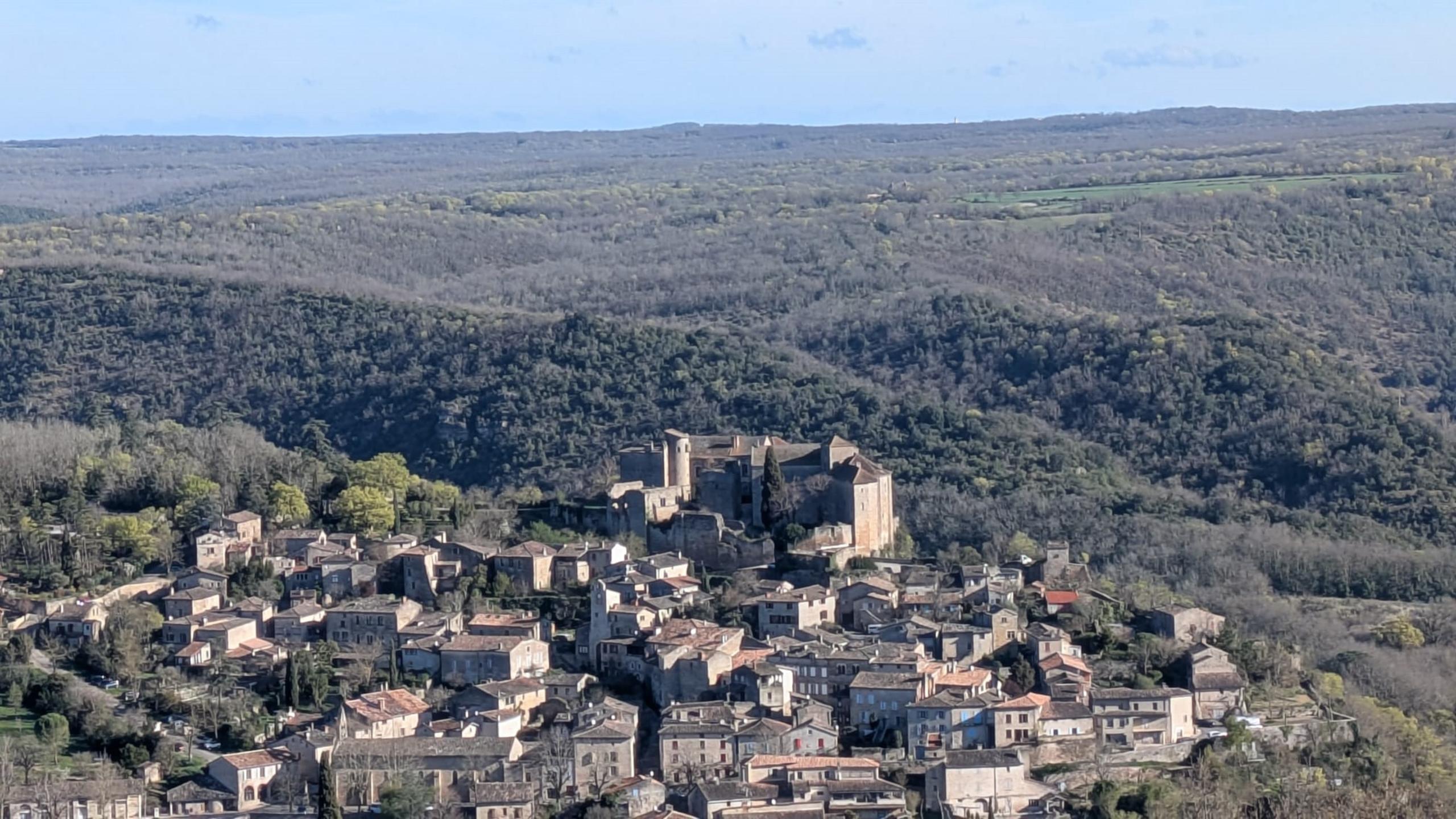 Km 28, le chemin de crête Las Costes devance les beaux sentiers du Mazuc en face du château médiéval de Penne.
